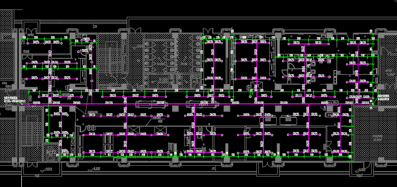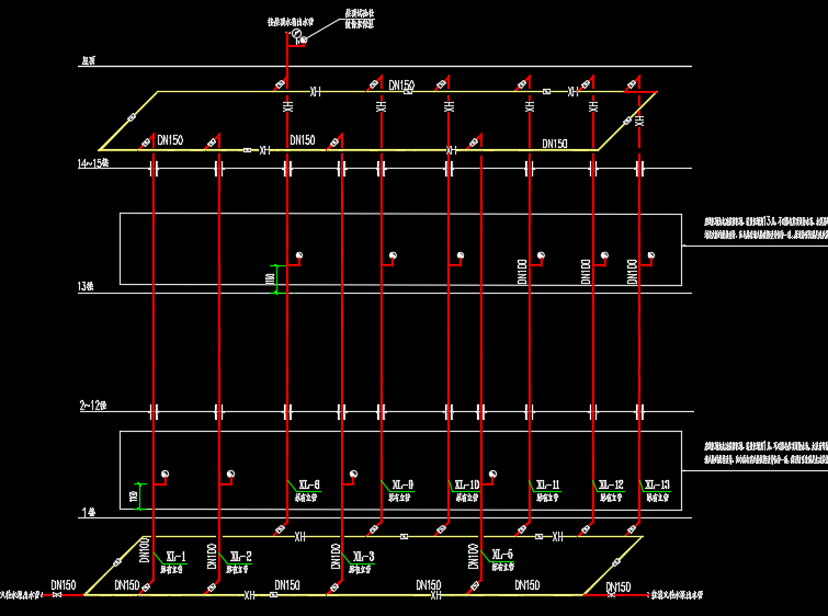 案例数据:由一层环状消火栓管网引出两路DN150消火栓干管接入室内环状消火栓给水系统。