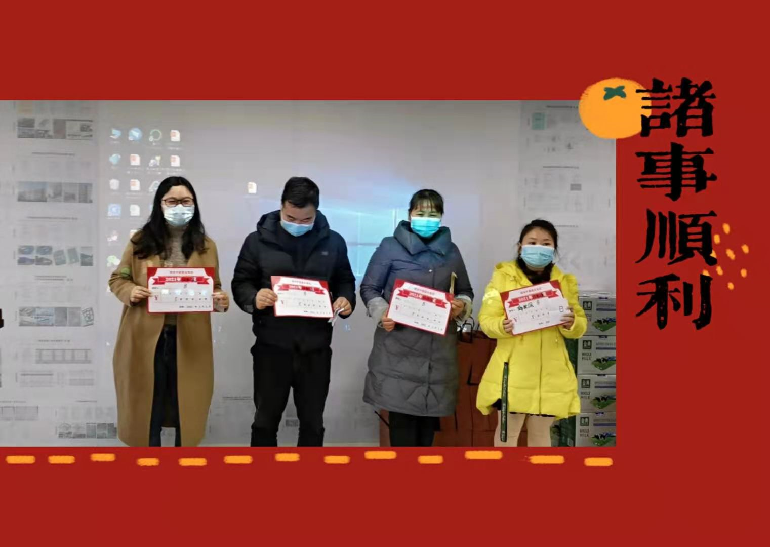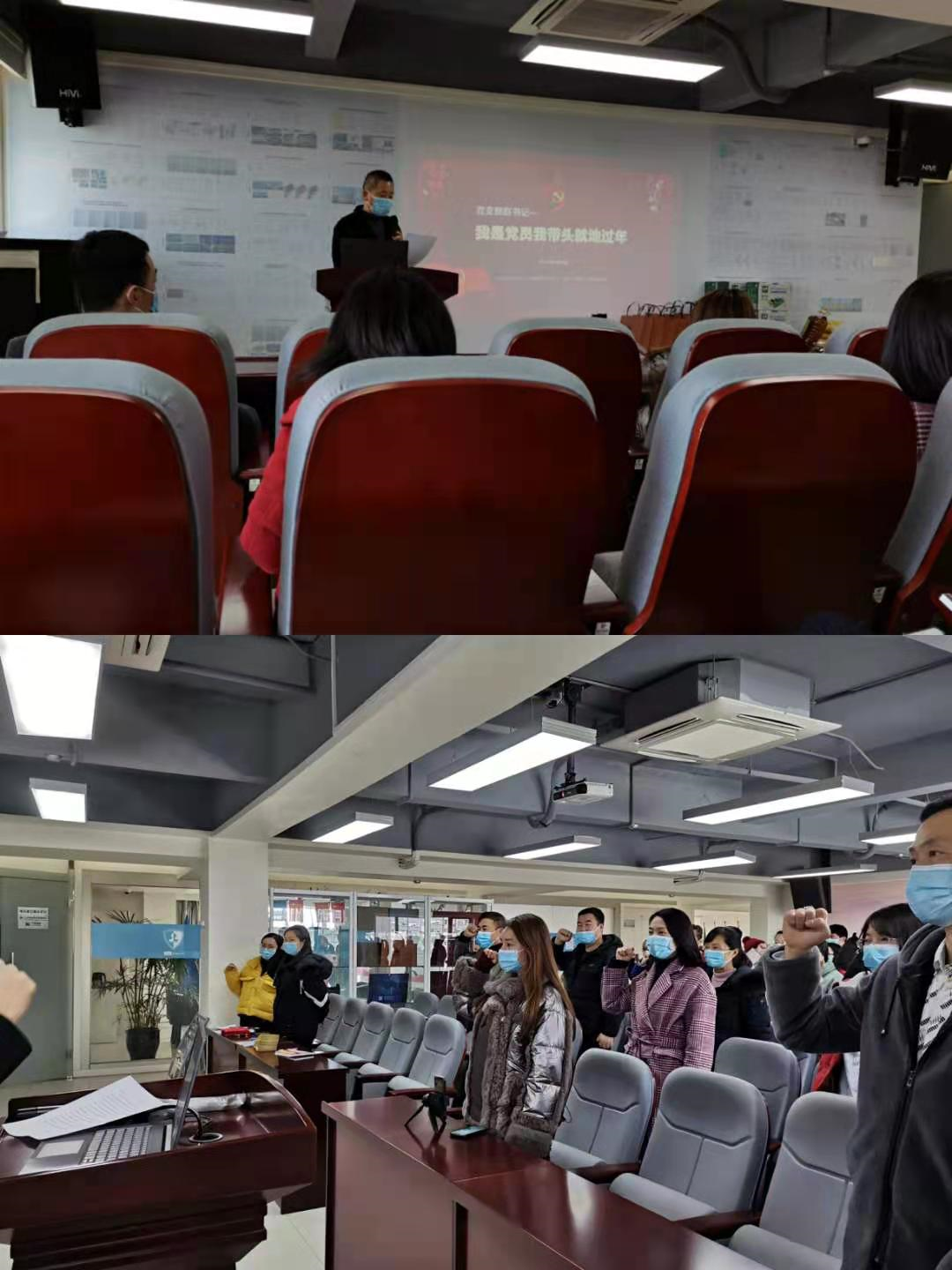 接下来员工代表李雨航,党总支部书记赵书记,以及集团管理者龚经理、曾经理分别上台做留蓉过年倡议。作为党员带头人,赵书记带头带领我们集团的党支部门集体宣誓,第一非必要不回家过年;第二放假期间坚持做好个人防护,降低感染风险。